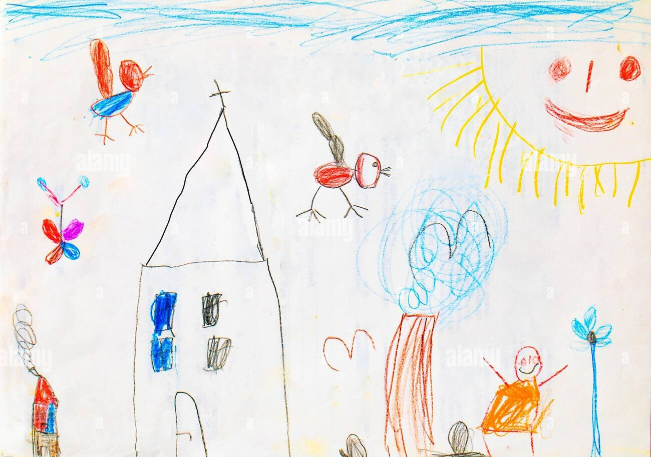In a child’s drawing, the sky is depicted as a horizontal blue streak at the top of the page.